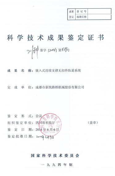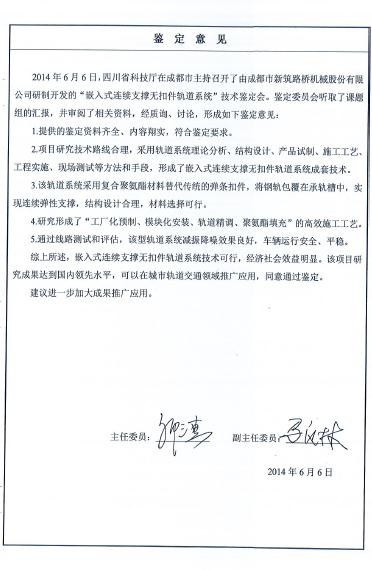 近日,由我公司自主研发的嵌入式连续支撑无扣件轨道系统通过了四川省科技厅的科学技术成果鉴定,取得了《科学技术成果鉴定证书》(证书编号:川科鉴字[2014]第438号)。