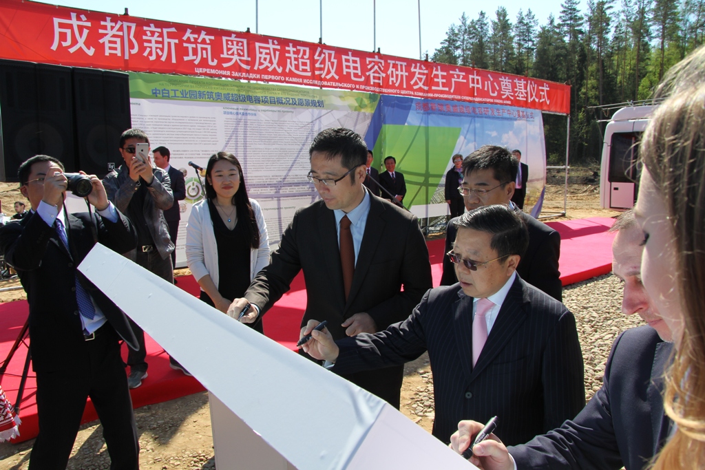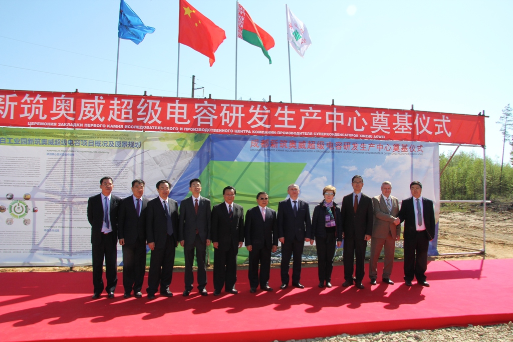 中白合资公司CEO胡政和中国驻白俄罗斯大使馆刘雪松参赞发言时总结亚新(中国)奥威超级电容项目是中白工业园“四个第一”项目:即是园区第一个正式动工的生产型企业;第一个已取得白俄罗斯具体订单的项目;第一个入园的具有世界领先水平的高科技项目;第一个当年开工,当年竣工的入园企业在建项目。