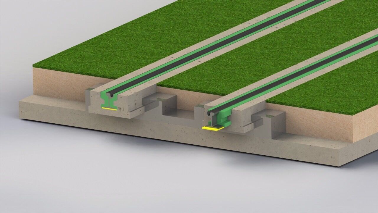 嵌入式轨道系统全称“嵌入式连续支撑无砟轨道系统”,是将钢轨嵌入到混凝土整体道床板中,采用弹性垫板连续支撑、高分子浇注料锁固钢轨的一种无扣件新型轨道结构。该轨道系统主要由预制轨道板、钢轨、弹性支撑构件、高分子材料等组成。