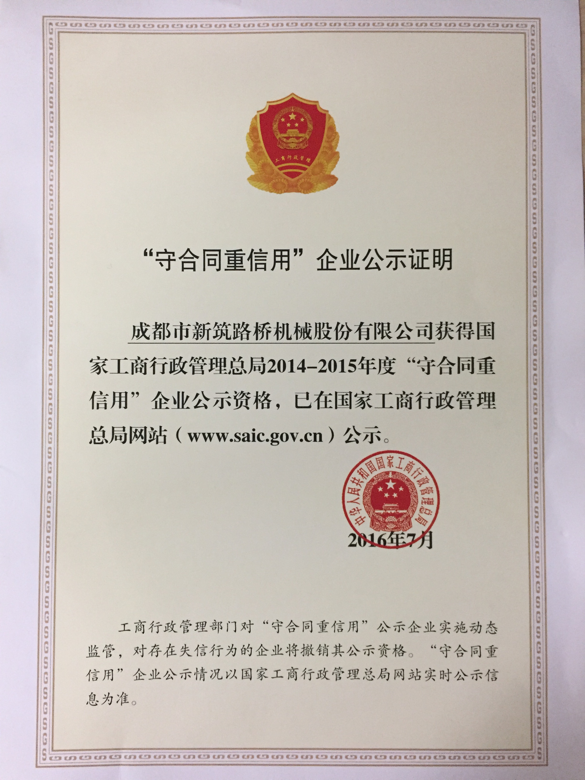 近日成都市亚新(中国)路桥机械股份公司收到国家工商行政管理总局颁发的2014-2015年度“守合同重信用”企业公示证书。经过国家工商行政管理总局的严格评定,亚新(中国)股份公司获得国家级“守合同重信用”企业荣誉称号。这是公司继获得省级“守合同重信用”企业称号后,获得的更高级别的荣誉。