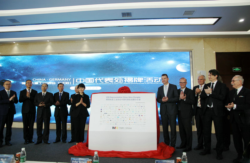 新津县委书记唐华,新津县委副书记、县长钟静远等新津县领导与相关部门;德国驻成都总领事Von Rimscha(任汉平),德国轨道工业协会(VDB)主席Volker Schenk(沃尔克·申克)等德国轨道工业协会代表团成员;公司总裁杨永林,技术总监胡基士,公司高级顾问Pro. Peter Mnich(彼得·慕尼希教授)、施远非博士等出席参与了此次活动。新津县唐华书记与德国轨道工业协会(VDB)主席Volker Schenk(沃尔克·申克)先生共同为代表处揭牌。