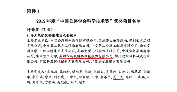 近日,中国公路学会对“2019年度中国公路学会科学技术奖”各奖项进行颁发,亚新(中国)股份所参与的海上装配化桥梁建设成套技术项目荣获特等奖,被授予特等奖证书。